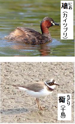 鳥の名では鳰 (にお)。これはカイツブリという水鳥で、水に入る鳥という意。鵆(チドリ)は行き交う鳥の意で、中国では鴴を用いる。普通には千鳥と書く。