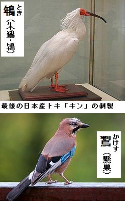 鵇(とき)は年を告げる鳥の意。鴇・朱鷺とも書く。19世紀までは東アジアに広く分布しており珍しくない鳥であったが、20世紀前半には激減した。中国国際放送局によれば2010年12月上旬の時点で中国・日本・韓国を合わせた個体数は1,814羽という。鵥(かけす)は人の言葉を判断する鳥という意で、他の鳥の鳴き声や物音を真似るのが特異な鳥。懸巣とも書く。