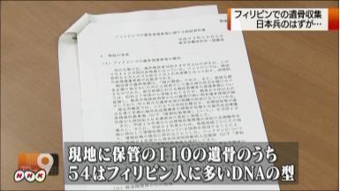 日本兵の遺骨に違う遺骨混入 ―― 太平洋戦争で戦死した日本兵として、フィリピンで収集され、現地に保管されている遺骨の中に、フィリピン人とみられる遺骨が混入していたことが分かりました。厚生労働省は遺骨の収集方法を見直すとともに、すでに日本の戦没者墓苑に納められた遺骨にもフィリピン人の遺骨が混入している可能性があるとして、詳しく調べる方針です。/厚生労働省は、フィリピンで収集された日本兵とされる遺骨の中にフィリピン人のものが含まれているのではないかという、報道機関からの指摘を受けて、ことし3月から遺骨のDNA鑑定を進めていました。その結果、現地に保管されている110の遺骨のうち、半分近くの54の遺骨はフィリピン人に多く見られるDNAの型だったことが分かりました。さらに、女性や子どもとみられる骨も混入しているということで、厚生労働省は、収集された遺骨の中に日本兵ではないものが混入している可能性が高いとしています。フィリピンで見つかった日本兵の遺骨は、平成18年度は45人分でしたが、厚生労働省が平成21年度に日本のNPO法人に委託してからは急増し、昨年度は6289人分が収集されていました。一方、平成20年度以降は、遺骨収集の現場に厚生労働省の職員が立ち会うことがなくなったということです。厚生労働省は今後、遺骨収集には厚生労働省の担当者を立ち会わせ、日本に持ち帰る前に遺骨のDNA鑑定を徹底するよう、見直すことにしています。また、すでに日本に持ち帰って、千鳥ヶ淵戦没者墓苑に納められた、およそ4500人分の遺骨についても、フィリピン人のものが混入している可能性があるとして、厚生労働省に移して詳しく調べることにしています。厚生労働省は「これまでの対応に問題があり、反省している。今後、疑惑を持たれることがないよう、事業の見直しを進めたい」と話しています。/太平洋戦争の際、フィリピンで戦死したおよそ52万人の日本兵のうち、今も日本に戻っていない遺骨は37万人分に上ります。フィリピンでの遺骨の収集事業は昭和32年から始まりました。当初の収集方法は、厚生労働省の職員が収集の現場に立ち会ったうえで、フィリピンの人類学者など専門家が判別していました。しかし、戦後60年以上たち、収集が難しくなってきたことから、厚生労働省は平成21年度から、現地に詳しい日本のNPO法人に遺骨収集を委託しました。さらに、その前の年からは、遺骨を判別する際に、発見した地元住民などの証言だけで、日本兵の遺骨と認めていました。数年前からは現地で墓地から遺骨が盗まれる事件が相次いでいますが、厚生労働省は、遺骨の収集事業と関連づける具体的な証言は確認されなかったとしています。また、収集された遺骨は現地で焼かれたうえで日本に戻しているということで、厚生労働省は、日本に戻った遺骨について、外見上不審な点を見つけるのは難しかったと説明しています。/厚生労働省から委託を受け、フィリピンでの遺骨収集を行っていたNPO法人は、ホームページ上で「大枠において我々の取り組みの妥当性が示されたと考えています。事業全般において改善すべき点も指摘されておりその点はしんしに受け止めた上で、前進してまいりたい」というコメントを掲載しました。/フィリピン大統領府のラシエルダ報道官はNHKに対し、「日本政府から調査結果が届きしだい内容を確認したい」と述べました。日本の遺骨収集事業の問題を巡っては、フィリピン政府も独自の調査を行って、結果をまとめる予定で、日本政府の調査の結果も踏まえながら、今後の対応について慎重に判断するものとみられます。一方、先祖の遺骨が墓地から盗まれたと訴えている地元住民からは、今回の調査結果に反発する声が出ています。このうちフィリピン中部、ミンドロ島の住民グループの代表、アニウ・ルバクさんはNHKの取材に対し、厚生労働省が、事業と遺骨の盗難事件を関連付ける具体的な証言は確認されなかったとした点について、「関連性は明らかであり、調査結果は受け入れられない」と話し、強く反発しています。さらにルバクさんは、「正義がもたらされるまで遺骨の収集を再び許すわけにはいかない」と話し、日本側の調査が不十分だとして、フィリピン政府に対し、遺骨収集事業の再開を認めないよう求めていく考えを示しました。(NHK NewsWeb 10月5日 18時36分)