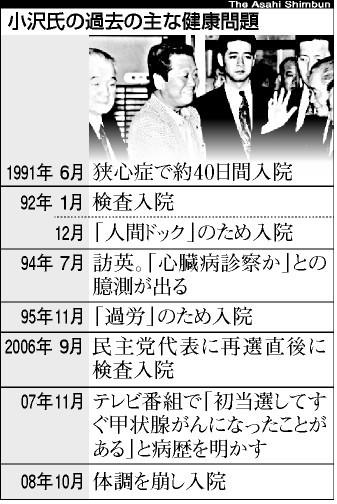 小沢氏、広がる健康不安 「大丈夫だ」沈静化に躍起 ―― 6日夜に救急搬送され、そのまま東京都内病院に入院した民主党の小沢一郎元代表(69)。病名は「左尿管結石」という。小沢氏の健康不安は、これまでもたびたび表面化してきたが、刑事裁判の初公判を終えた当夜の体調不良に、政界には驚きが広がった。/ 「検査の結果、左尿管結石と判断しました。経過を観察中です」。小沢氏が入院した日本医科大付属病院(東京都文京区)の福永慶隆院長と本間博医師は7日、記者会見して小沢氏の病状を説明した。/6日の初公判終了から約4時間後の午後8時ごろ、腰に強い痛みを感じて嘔吐(おうと)。その後も激しい腰痛と嘔吐があり、自宅から救急車で搬送された。1週間程度の入院が必要という。/小沢氏には、健康不安がつきまとう。1991年には狭心症で約40日間入院。最近では、民主党代表当時の2008年10月に体調を崩して入院している。/ 刑事裁判は今月14日に2回目の公判が予定されている。本間医師は、延期やドクターストップの可能性について「本人に聞かないといけない。その場で考えたい」と述べるにとどめた。/支持候補も含めて小沢氏は党代表選に3連敗したうえ、刑事裁判で身動きが取れず、求心力に陰りが見える。それだけに、広がる波紋を鎮めるのに躍起だ。/小沢氏は7日朝から、民主党の輿石東幹事長や鳩山由紀夫元首相に電話で「心配かけて悪かった。大丈夫だ」とアピール。見舞いに訪れた側近の樋高剛、松木謙公両衆院議員や小沢グループの谷亮子参院議員らには、点滴を受けながら「痛みがある時は痛いけど、ない時は何ともない」と笑顔を見せた。/小沢グループの議員によると、病院側の記者会見も「メディアが騒いでうるさいから、病状を教えてやれ」と小沢氏が指示して設定したという。別の側近議員は「結石なんて病気じゃない。石さえ出ればすぐに退院できる」と強調した。 (asahi com 2011年10月7日22時27分)