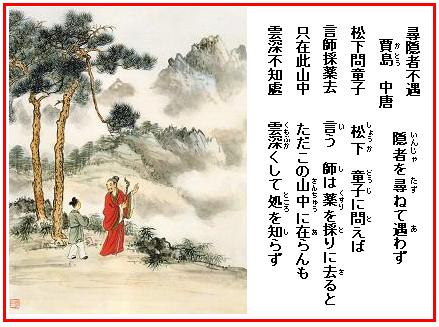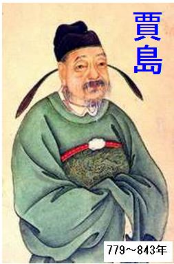賈島(779?~843年)は范陽(河北省涿県)の人で、字は浪仙。何度も科挙に落第したすえ、僧となって無本と号し、長安に出て青龍寺に住んだ。やがて詩才を韓愈に認められて(その動機が「推敲」の故事として有名な伝説となっている)、勧められて還俗し、長江(四川省蓬渓の西)の主簿に任じられ、普州(四川省安岳の北)司倉参軍に転じたが、赴任しないうちに死んだ。そのときは一文の貯えも無く病んだろばと古い琴があるだけであったという。