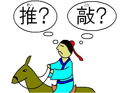 島(とう)、挙(きょ)に赴(おもむ)きて京(けい)に至(いた)り、驢(ろ)に騎(の)りて詩(し)を賦(ふ)し、「僧(そう)は推(お)す月下(げっか)の門(もん)」の句(く)を得(え)たり。