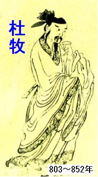 杜牧(803-852年)、字は牧之。若年の頃は美貌の風流才子として浮名を流したが 性剛直で奇節あり『孫子』の研究者としても知られている。晩唐詩壇の繊細優婉な一般的傾向とは別格の男性的気概の作風は豪邁と艶麗の両面を兼ねそなえ 詠史・時事諷詠に長じ特に懐旧の情をもった絶句に名作が多い。