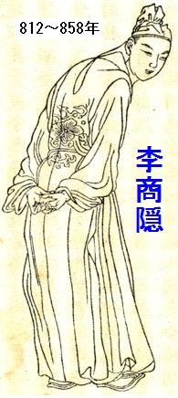 李商隠(812~858年)は、晩唐の官僚政治家で、時代を代表する漢詩人。字は義山、号は玉谿生。また獺祭魚(だっさいぎょ)と呼ばれる。懐州河内(現・河南省沁陽市)の人。官僚としては不遇だったが、その妖艶で唯美的な詩風は高く評価されて多くの追随者を生み、北宋初期に一大流行を見る西崑体(故事を多用し、音節の調和を重視し、言葉の美麗だけを追求する)の祖となった。ちなみに李商隠のあだ名、獺祭魚は、李商隠が詩作するさいに参考にするため、数々の書物を机の上に並べて置いたのが、川獺(カワウソ)が捕らえた魚を並べるという習性に似ていることから付けられたものであるという。
