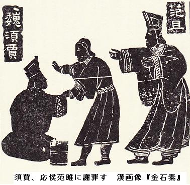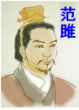 范雎(?~BC225年?)は魏の人で、諸侯の間を遊説し、魏の大夫・須賈に仕えた。須賈の共をして斉へ使者として赴き、その地で数ヶ月間を過ごした。この時に斉の襄王が范雎の弁舌が優れていることを聞いて金十斤と牛・酒を送ってきたが、范雎はこれを断った。ところがこれを須賈が邪推し、魏の秘密を斉に漏らした代金としてこれらの品物を送ってきたのだろうと考えた。魏へと帰ってきた須賈は宰相の魏斉へと報告した。魏斉は怒って范雎を竹の板で何度も打った。このことで范雎はあばらを折り、歯をくじいた。これでは殺されると思った范雎は死んだ振りをしたが、魏斉は范雎を簀巻で巻いて厠へと放り出し、客は厠へと来るたびに范雎に小便をかけていった。范雎は番人に「後で礼をするから」と約束して助け出してもらい、番人は魏斉に対して死体を捨ててきたと嘘を言った。
