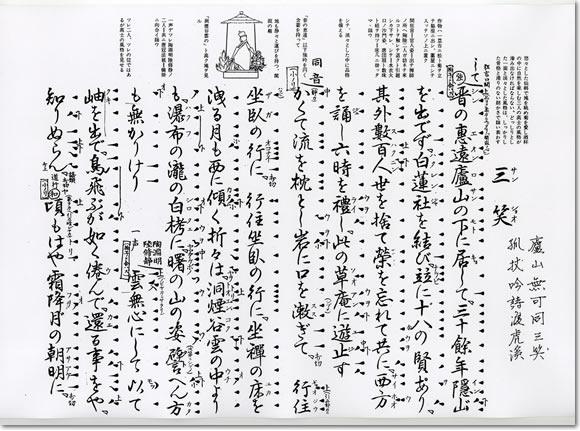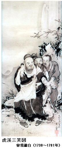 即ち、虎渓三笑とは、儒、仏、道の三賢者が一堂に合して話をしたところ、お互いにつきない興味を感じ、すっかり夢中になってしまったという故事となったのであろう。しかし、この3人生没年があわないので、虎渓三笑の話は作り話とされている。