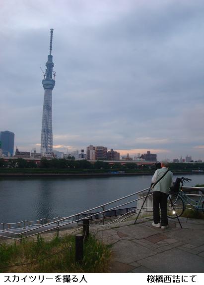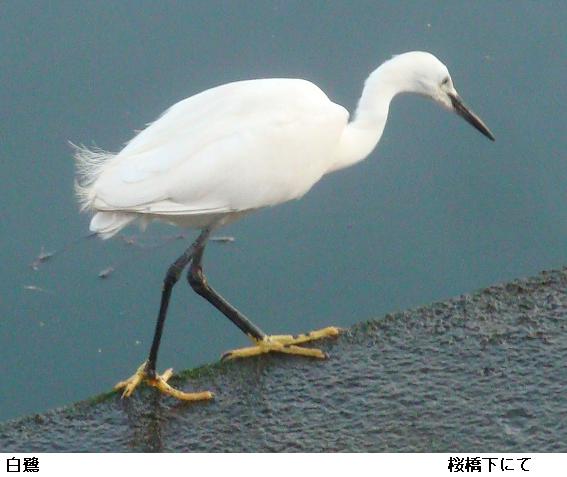 ここ桜橋近辺では滅多に見られない白鷺が一羽川辺に遊んでいた。