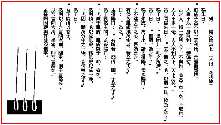 「むかし伯成子高(はくせいしこう)は、体の毛一本を抜くほどのわずかの犠牲でも、それによって他人の利益を計ろうとはせず、大名の地位を棄てて隠者となり農耕に従事した。また偉大な帝王であった禹は、一身のために自己の利益を計ろうとはせず、そのために身体じゅうが半身不随になったと言う。