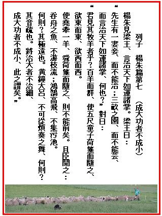 「殿はあの羊飼いをご覧になったことがございますか。百匹もの羊が群れをなしていますが、幼い童に、鞭を肩にかついて後ろからついてゆかせれば、東に行かせようと思えば東、西に行かせようと思えば西と全く思うままです。とろこでもし尭に一匹の羊を引張らせ、舜に鞭を肩に担いで後ろからついてゆかせれば、とても羊を歩かせることは出来ません」