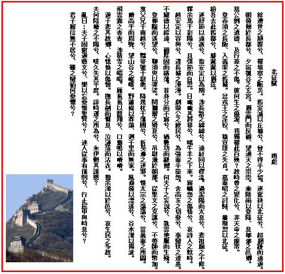 次の『北征賦』の「征」とは旅行の意であり、掲載書の「文選」では紀行の類に入れてある。現存するものでは「○征賦」と題するものの最初の作品と思われる。彼以後のものとしては曹大家の「東征賦」、晋の潘岳(はんがく、247~300年)などが有名であり、杜甫の長篇叙事詩「北征」など後世の紀行詩にも多くの影響を与えたといわれる。