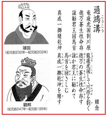 そこで、二人は「漢楚中分」の盟約を結ぶ。鴻溝という川を挟んで西を「漢」(劉邦)、東を「楚」(項羽)と取り決め、天下を二分した。