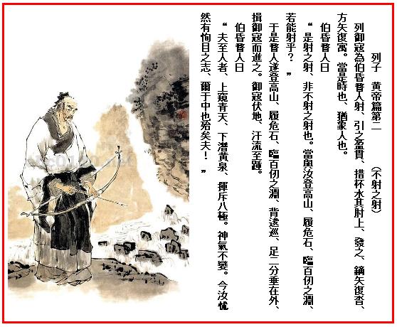 「期の弓は〈射の射〉すなわち弓を射ることを意識した有心の射撃であって、〈不射の射〉すなわち射ることを念頭に置かぬ無心の射撃ではない。もしそなたと高い山に登り、そばだつ岩石を踏んで立ち、百仞もある深い淵を見下ろすとすれば、そなたにいったい、かくも見事に弓がひけるかどうか」