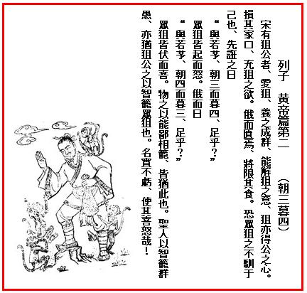 いったい万物の「能鄙(のうひ)」すなわち利口な奴と野暮なやつとが籠絡(くる)めあう道理はみなこういったものである。そして聖人が其の叡智で無知な人間をくるめ込むのも、ちょうど猿回しの親方が頭で猿どもをくるめこむような者である。言葉の実質は少しも変らないのに、相手をよろこばせたり怒らせたりしているのである。