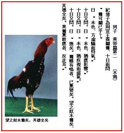 「もう殆んど完璧です。他の鶏が鳴き声を立てても、もはや何の反応も示しません。遠くから見ると、まるで木で作った鶏のようです。無爲自然の徳を完全に身につけています。他の鶏で相手にしようとするものは無く、背を向けて逃げ出すばかりです」