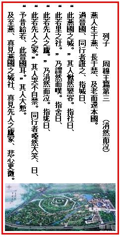 燕の国のある男が、燕の国で生まれて楚の国で育った。彼は年老いてから生国の燕の国に帰ろうとして、その途中、晋の国に立ち寄った。ところが一緒に旅をしていた男が彼を騙し、晋の国の都城を指さして、
