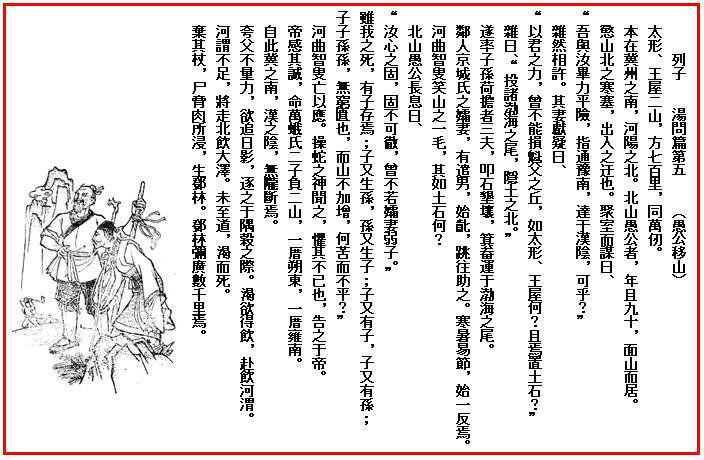 太行山(原文の大形は誤記か?)・王屋山の二つの山は、広さは七百里四方、高さは一万切(ひろ)もあるが、もともとは冀州(河北省)の南部、河陽(河南省)の南部にあった。ところが北山愚公という老人がいて齢はもう九十に近かったが、この大行・王屋の山を真向かいにして住んでいた。彼は山の北側が険しく塞がっていて、出入りの度に遠回りしなくてはならないのを苦にやみ、家族を集めたこう相談した。
