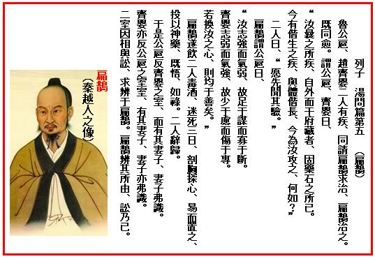 扁鵲はかくて二人に毒を入れた酒を飲ませた。すると三日間ほど仮死状態に陥り、その間に胸を解剖し心臓を取り出し、それを取り替えてもとの位置に返し、手術が終ると、霊妙な薬をのませた。やがて目が覚めると、初めと少しも変らず、二人は辞去して家に帰った。