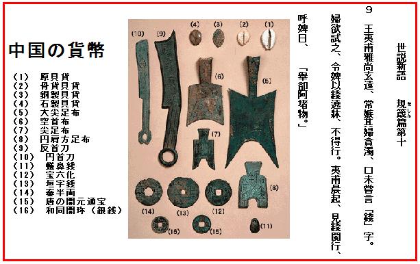 王夷甫(256~311年、夷甫は字で、名は衍)はもともと深遠な道を尊ぶ人であったので、いつもその妻が貪欲なのを憎み、まだ一度も銭という字を口にしたことがなかった。妻はこれを言わせようと試み、下女に命じてその寝台の周囲に銭を置き、歩くことが出来ないようにしておいた、王夷甫は朝早く起き上がり、銭が歩く場所を塞いでいるのを見ると、下女を呼びつけていった。