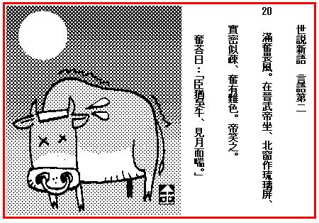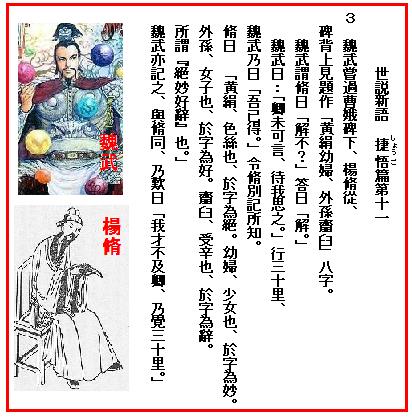 魏の武帝がある時曹蛾の碑の下を通り過ぎたことがあるが、楊脩もお供をしていた。碑の裏に「黄絹幼婦外孫齏臼(せいきゅう)」の八字が書かれているのを見て、魏の武帝は楊脩に言った。「判るか? どうかね?」