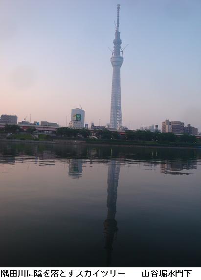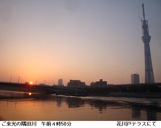 午前4時30分。吾妻橋~白鬚橋間の隅田川を一周。朝靄の中、南西の空に立ち待ちの月(旧暦17日の月)が浮かんでいる。東の川向こうでは今しもご来光。