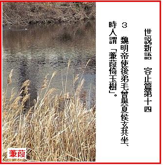 ※ 『魏志』によれば、夏侯玄は毛曾と同座するのを恥じ、これを顔色に現したので、明帝は怒って夏侯玄を羽林監に左遷したという。毛曾はなりあがりものであるから品がないので葦にたとえ、夏侯玄を玉樹に譬えたのであろう。これが故事となり、何の才能もなく貴戚の席にあることを「蒹葭、玉樹に倚る」という。