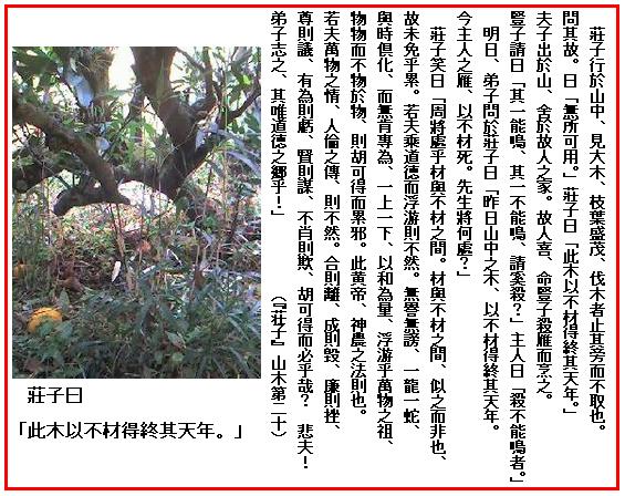 「周は材と不材の間に立つことだろう。といって材と不材の間というものは、似て非なるものだ。だから累は免れまい。ところが、道徳に乗じて浮遊するものはそうじゃない。誉もなければ訾(そしり)もない。あるいは龍となりあるいは蛇となって、時と共に変化して、固執しようとはしない。あるいはのぼり、あるいはさがり、和〔同〕を量〔度(規準)〕とする。万物の祖に浮遊し、物を物とするが物から物されることはない。そうしたらどうして累(わずら)わすなどということができようね。これが神農・黄帝の法則なのである。しかるに、万物の情や人間の伝承といったものは、そうではない。合えば離れ、成就すれば毀(やぶ)れ、廉(かど)があれば挫(くじ)かれ、尊ければ非難され、有爲なものはそこなわれ、賢いものは謀られ、不肖のものは欺かれる。そしたらどうして必然だなどということができようね。かなしいことだね、弟子たちよ! これを心にしてしておくがよい。あとはただ道徳の郷しかないのだよ」 (中国古典文学大系4)
