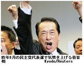 菅内閣大勝利、日本の政治は分かりにくい ―― 「日本の政治は分かりにくい」というフレーズは聞き飽きていると思うが、2日に永田町で起きた拍子抜けするような見せかけの対決は、分かりにくいとしかいいようのないものだ。/昨年9月の民主党代表選で気勢を上げる菅首相2日の衆院本会議では内閣不信任決議案が反対多数で否決された。ただ、菅直人首相は、東日本大震災と福島原発事故の収束に一定のメドをつけた段階での退陣の意向を表明したことで、首相の座を追われるのを当面免れただけだ。辞任の意向を表明した菅首相は事実上の「レームダック」といえる。さて、2日に永田町では何が起きたのか。そして、今回の出来事の本当の意味は何なのだろうか。/菅首相の力は不信任案採決後に強くなった。純粋に「強い」という意味では決してない。採決直前よりましになったというだけだ。/2日朝まで、民主党はまさに大分裂の危機にあった。民主党議員の約4分の1が不信任案に賛成票を投じ、離党するとみられていたのだ。しかし、ふたを開けてみれば、大多数が反対票を投じ、当面は党が団結したまま維持される結果となった。/党内で菅首相の最大の脅威となった小沢一郎元代表は菅氏を首相の座から引きずり降ろそうとしているかのようにみえた。しかし、小沢氏は不信任案採決に欠席。小沢氏支持の議員も反対票を投じた。欠席を選択した小沢氏の力は採決前より弱まったようにもみえる。一方、菅首相は地震・津波対策、原発事故処理などに関連する最優先の法案を通過させる上で、衆院の過半数議席を握る民主党の議員からほぼ全面的な後押しを得られることになった。不信任案採決前の数週間、首相はこのような力を失っていた。/民主党が菅首相の退陣を迫るためには、有力な後継者の擁立が恐らく必要だろう。しかし、民主党は現在もいくつかの派閥に分かれたままで、有力な後継者は見当たらない。最近、民主党内で活発化していた「菅降ろし」だが、注目に値する事実が1つある。菅降ろしは純粋に「反菅」感情による動きだということだ。民主党議員が有力な後継者の周りに集結するような動きはまったくみられなかった。/菅首相が一定のめどがついた段階での退陣を表明したことは事実だが、具体的な期日は表明しておらず、退陣がいつになるかは不透明だ。民主党員のなかには「夏前もしくは夏中」の退陣になると予想するものもいるが、これが現実になったとしても、菅首相の在任期間は最近出ていた多くの予想よりも長期化することになる。/菅首相が首相の座にしがみついて、退陣を拒んだらどうだろう。「反菅」議員はどのような動きに出るのだろうか。再び、不信任案を提出するつもりなのだろうか。 (ウォール・ストリート・ジャーナル日本版 2011/6/3 14:01)