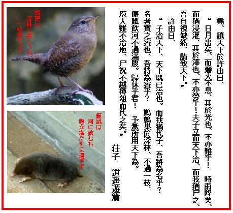 尭は天下を許由(頴川陽城の人で、箕山に住む隠者)に譲ろうとしていった。「月や日が出ているというのに、まだ篝火を焚いていましたら、篝火の明るさなど役に立たぬものではありませんか。ほどよい雨が降っているというのに、まだ水をかけていましたら、地面を潤すのも無駄骨ではありませんか。もし先生が天子の位につかれるなら、天下は治まります。だのに私がまだ天下のことを扱っていては、自分でもおこがましい気がいたします。お願いですから天下を差し上げとうございます。」/許由はいった。「あなたが天下を治められて、天下はもうすっかりおさまっております。だのに私があなたに代わったりしたら、私は名を求めようということになりましょうね。(実を主人とすれば)名は実のお客様です。私はお客様になろうというのでしょうか。鷦鷯(みそさざい)が深い林に巣を作っていても,一枝以上はいりません。偃鼠(もぐら)が河で水を飲んでも、腹いっぱい以上は飲めません。もういいからお帰り下さいな、あなた。私には天下などどうしようもありませんわ。料理番が料理を作らないからといって、尸(かたしろ)や祝(かんぬし)が酒樽やお供え物を越(奪、うば)って(料理番の)代わりなどしませんように」