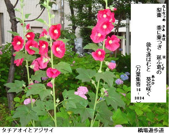 タチアオイは小アジア、中国の原産。日本へは古く薬用として渡来した。唐代以前は、蜀葵(しょくき)の名前で一番の名花とされた。