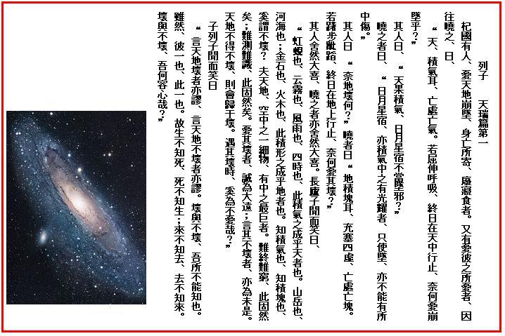 「虹蜺(にじ)や雲や霧、風雨や四季の推移は気の集まりが天界で成した現象である。また、山岳(やま)や河や海、金や石、火や木などは、形(もの)が集まって地上で成した現象である。もしこれらが気の集まりであり物塊の集まりであることを知れば、集まったものは必ず散(わか)かれるから、天地が崩壊しないなどとどうしていえようか.いったい天地というものは広大な宇宙空間の中の一つの微小な存在でしかないが、形地あるものの中ではもっとも巨大なものである。その本質が尽くし難く究め難いのも、もとより当然であり、その正体が測り難く識り難いのも、もとより当然である。とはいえ天地が崩壊すると心配するのは、いかにも遠大すぎ、崩壊しないと主張するのは、必ずしも正しいとは言えない。天地が崩壊せざるを得ぬとすれば、最後には崩壊してしまうのであり、その崩壊する時にめぐり合わせれば、憂い悲しまずにはおれないのだ。」
