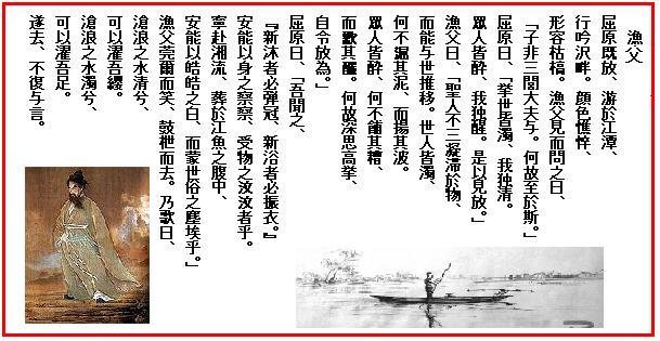 屈原(くつげん)既に放たれて、江潭(こうたん)に游び、行(ゆくゆ) く沢畔(たくはん)に吟ず。顔色憔悴し、形容枯槁(ここう) せり。漁父(ぎょほ)見て之に問うて曰く、「子は三閭大夫(さんりょたいふ) に非ずや。何の故に斯(ここ) に至れるか」と。屈原曰く、「世を挙げて皆濁り、我独り清めり。眾人(しゅうじん)皆酔ひ、我独り醒めたり。是を以て放たれたり」と。