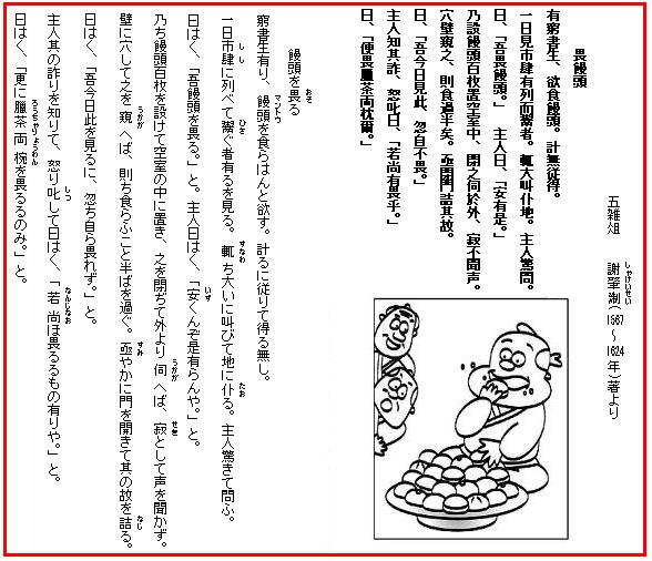 学問をやるだけで科挙の試験を受けないというのなら話は別であるが、学問をやって科挙を受け、科挙を受けるからには及第を願い、及第して仕官し、仕官して昇進するということは、いやしくも道理と道義に反した行いがなければ、どれも不可はないのである。ところが世間には一種の人間があって、仕官して俸禄を得ると、今度は逆に、宮仕えせぬこそ高邁なれとばかり、昂然となって、まるでその官を捨て去りたいみたいな風を見せる。とても本心とは受け取れない。だから彼らの稼ぎ振りと来たら、本来の仕官志望者の場合よりもえげつないほどで、強引にきっかけを作って割り込んだり、あるいは、ことさらにつまらぬ畏を立てて辞めようとして見せたり、そこで留まるでもなく辞めるでもない態度をとって、そのことでしばしばうまく世間の評判をせしめ、やがていい地位を与えられると辞退もせぬ、といったやりくちである。しかも世間は、とんとそこのところに気付かぬままだ。/こういう話がある。ある貧乏書生、饅頭(マントウ)というものを食ったことがない。しかし手に入れる術もない。或日、町でそれを並べて売っている店を見つけると、大声を挙げてぶっ倒れた。店の親父は吃驚して訳を訪ねると、「饅頭がこわい」という。「そんなことがあるものか」と、親父は饅頭百個ばかりを空き部屋に用意して、その男を閉じ込め、そっと外から様子を窺っていたが、ひっそりとしてものおともせぬ。そこで壁に穴を空けて覗いてみると、両手で掴み食いの最中、もう半分以上も平らげている。急いで戸を開けて、その訳を詰ると、男曰く「これを見た途端怖くなくなったよ」騙されたと知って親父おこりだし、「まだ怖いものでもあるんかい」と怒鳴ると、その男曰く、「まだあるよ、お茶二杯がこわいんだ」/こんなのが、仕官せぬことを願う連中の実態でもあろうか。 (中国古典文学大系55 近世随筆集より)