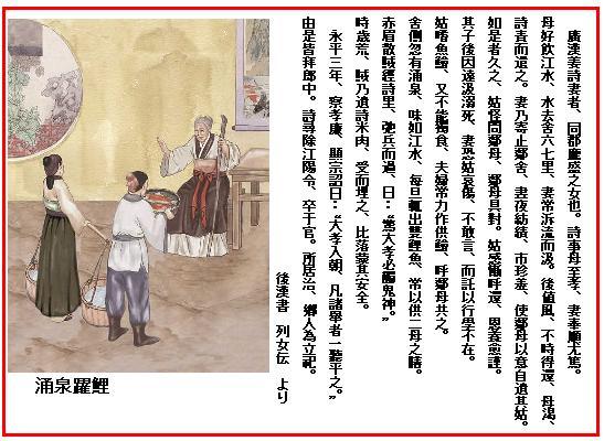 広漢郡(四川省)の姜詩の妻は、同郡の龐盛の娘である。姜詩は母に対して至って親孝行であった。妻はとりわけこの姑によく仕えた。/姑は大川の水を飲みたがる。川は家から六、七里(1里は0.4km)離れている。妻はいつも流れを遡って水を汲んだ。その後の或る日、大風が吹いて、すぐには汲めぬまま引き返した。姑は喉を渇かした。姜詩は妻を叱って追い出した。/すると妻は隣の家に泊めてもらい、昼も夜も糸を紡ぎ、その金で珍しいご馳走を買っては、その家の婆様に頼んで、その婆様からということにして姑に届けてもらった。そうしたことが暫く続く。姑は怪しんで隣の婆様に問う。婆様は委細を打ち明けた。姑は感じ入り恥じて嫁を呼び戻した。妻はいよいよ気をつけて姑に尽くした。/その後、わが子が遠くに水汲みに行ったところ、溺れ死んだ。妻は姑が悲しんでがっかりしはせぬかと気遣い、事実を言わず、遠くに遊学に出たといいくるめた。/姑は魚の刺身が好きである。さりとて自分ひとりで食べることも嫌いである。夫婦はいつも精出して働いては刺身を買い、隣の婆様を呼んで姑と一緒に食べさせた。家のわきに突然泉が湧き出した。泉の味は揚子江の水のようで、毎朝かならず二匹の鯉を出す。いつもそれを二人の婆様の膳につけた。/赤眉(王莽に抗して起こった流賊)の残党が姜詩の村を通りかかったが、刃を鞘に収めてそのまま通過した。「大の孝行者を驚かしては、きっと鬼神の祟りがあろう」というのである。当時は飢饉であった。賊は遂に姜詩に米と肉を贈った。詩は受け取ったが、食わずに埋めた。近隣の部落は姜詩のお蔭で無事であった。/永平三(AD60)年、詩は孝廉(登用の一資格)に推薦された。明帝は詔勅を下してこう言った。「大孝の人がわが朝廷に入った。同時に推挙されたものはすべて右に倣って採用を許す」 これでみな郎中(宿営の官)に任ぜられた。姜詩は次いで江陽(四川省濾県)の県令に任ぜられ、任地で亡くなった。詩のいた地方は良く治まり、里の人は詩のために祠を建てた。