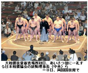 角界再生誓い技量審査場所 ―― 大相撲の八百長問題の影響で夏場所に代わって一般に無料公開される技量審査場所が八日、東京・両国国技館で初日を迎えた。約一万一千席の客席はほぼ埋まった。/事前に抽選などで入場券が配られ、当日券は二階椅子席に限り一千席分が用意された。午前八時に配布が始まり、同十時前になくなった。東日本大震災の被災者も宮城、福島から招かれた。/技量審査場所は通常開催を目指す七月の名古屋場所の番付を編成するために開催。協会内部の行事のため優勝や三賞はあるが、賜杯や外部表彰、懸賞はすべて辞退した。NHKは中継を見送った。/放駒理事長(元大関魁傑)は協会あいさつで八百長問題に触れ「今後、根絶と再発防止に取り組み、全力で生まれ変わった日本相撲協会を目指す」と誓った。 (東京新聞、2011年5月9日 朝刊)