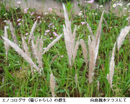 向島のテラスにはヒメジョオン(姫女菀)やエノコログサが所狭しと繁茂している。