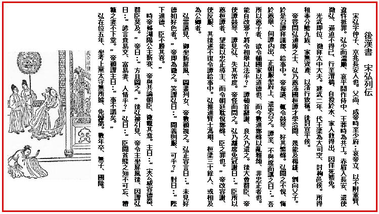 宋弘、字は仲子。京兆(陝西省)長安県の人である。父の宋尚は、前漢成帝の時(BC32~37年)、少府(九卿の一つ、天子の給養を司る)にまでなった。哀帝(BC6~1年、在位)が立つと、董賢(男色で哀帝に寵せられ大臣となる)に諂わなかったため、機嫌を損ね罪に陥った。/宋弘は若い頃から温順であった。哀帝・平帝の間(BC6~AD5年)に侍中(侍従)となり、王莽の時には共工(少府を王莽が改名した)となった。/赤眉が長安に入ると(25年)、使者を派遣して弘を召した。弘は強制されて逃げ切れない。連れられて渭橋(長安城北の橋)にさしかかった時、川へ身を投げた。家の者が救い上げたが、そのまま死んだふりをして赤眉から免れることが出来た。