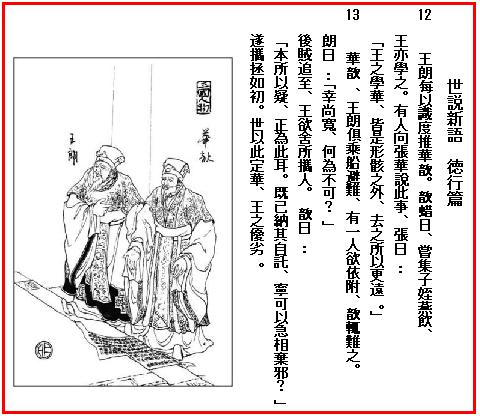 13. 華歆と王朗とが、いっしょに舟に乗って戦乱を避けたことがある。そのとき一人の男が道連れにしてくれと頼んだ。華歆はこれに難色を示したが、王朗は「さいわい、まだ余裕があるから、何も断わる必要はあるまい」と言って、乗せてやった。