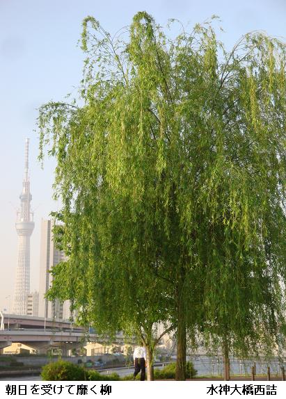 水神大橋を渡って、白鬚橋に向って南下する。柳の大樹が朝日に照らされて靡いている。