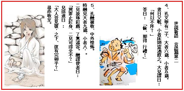 5.孔融(孔文擧)が捕えられ、朝廷の内外とも恐れおののいた。そのとき孔融の子の大きいほうは九歳、小さいほうは八歳であった。琢釘(釘刺し)の遊びを続けていて、すこしも慌てる様子がなかった。