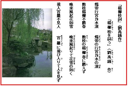 劉禹錫〈772~842年〉は中国、中唐期の詩人。中山(河北省)の人という。字(あざな)は夢得(ぼうとく)。柳宗元・白居易と親しく詩を応酬し、「劉柳」「劉白」と称された。民間で歌われていた「竹枝詞」などを文学作品に高めたことで知られる。