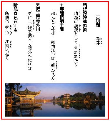 ▼韋荘(836~910年)は杜陵(長安郊外)の人。科挙に落第を続け、昭帝の乾寧元(894)年に漸く及第し、校書郎に任ぜられた。当時四川省に居た王建が反乱を起こしたので、朝廷では宣撫の使者を送り、荘もその一員として随行したが、そのまま王建に仕えて、建が後蜀王朝を樹立するのに協力し、その宰相となった。
