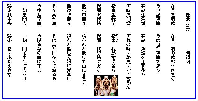 生があれば必ず死がある/若死にも命が縮んだわけではない/昨夜は同じ生き身の人も/今朝は亡者の過去帖に名が/魂はこの身を離れて何処へ行く/枯れ果てた体を棺に預けたまま/甘えっ子は父を求めて泣き喚き/親友は私を撫でて啜り上げる/わが人生の得失は知らぬ/死後の批判も知らぬこと/千年万年経った後の/恥も栄誉も知ったことか/心残りは この世にいたとき/酒が存分飲めなかったこと
