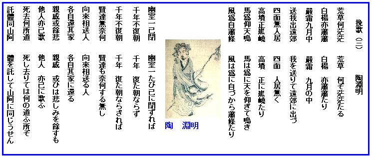 生い茂る草の何と果てしなく/はこやなぎも淋しげにそよぐ/厳しい霜置く九月の頃/私を送って郊外に出る/見渡す限り人家も泣く/高い塚のみ連なり聳える/馬は為に天を仰いで嘶(いなな)き/風は為に物淋しげに吹く/暗い墓穴は一度閉ざせば/千年経っても朝は来ない/千年経っても朝が来ぬのは/達人賢者もどうしようもない/今しがた野辺の送りに来ていた人も/それぞれ己の家へと帰る/親戚はあるいはまだ悲しんでいようが/他人の中にはもう鼻歌歌う奴もいる/死んでしまえば言うことはない/体を預けた山の土となろう