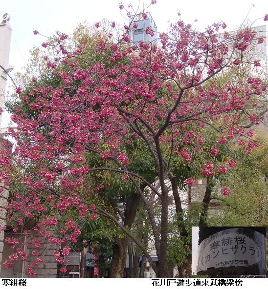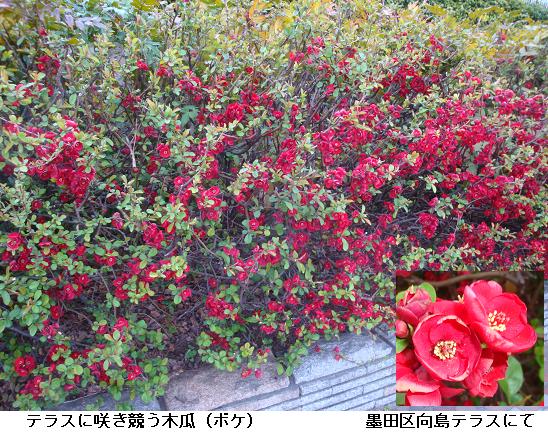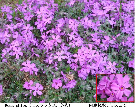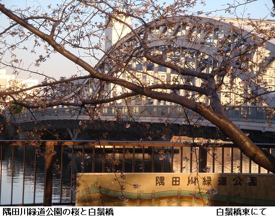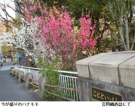 言問橋を渡り、西詰にくると白と赤のハナモモが、今を盛りと咲いている。ハナモモは原産地は中国。花を観賞するために改良されたモモで、花つきがよいため、主に花を観賞する目的で庭木などによく利用される。日本で数多くの品種改良が行われ、種類が豊富。観賞用のハナモモとして改良が行われるようになったのは江戸時代に入ってからで、現在の園芸品種の多くも江戸時代のものが多い。サクラの開花前に咲くことが多く、桃の節句(雛祭り)に飾られるという。