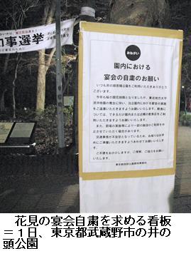 花見自粛は「行き過ぎ」の声 都は公園の看板でお願い ―― 花見の名所、上野公園(東京都台東区)などを管理する都が、宴会自粛を呼び掛けている。東日本大震災の被災者や計画停電に配慮したものだが「行き過ぎ」との声も出ている。/上野公園は約1200本の桜があり、例年シーズン中に150万人以上の花見客でにぎわう。都は震災以降、園内30カ所に宴会の自粛を呼び掛ける看板を設置した。約500本が咲き誇る井の頭公園(武蔵野市)でも同様の看板が目立つ。/「地震発生に伴い、公園内の宴会自粛をお願いします」などの記載があり、都公園課は計画停電なども理由に挙げ、ごみが大量に出る宴会は好ましくないとの見解を示している。/石原慎太郎知事は3月29日の記者会見で「少なくとも夜間、明かりをつけての花見は自粛すべきだ」と発言。30日の集会では「この時期に昼間だろうと花見で酒飲んでる時代じゃない。東京で花見なんかするわけには、絶対にいかない」と述べた。/これに対し、蓮舫節電啓発担当相は1日に「権力で自由な行動や社会活動を制限するのは最低限にとどめるべきだ」と反論。経済評論家の山崎元さんは「明らかに行き過ぎ。花見や宴会を自粛させることは経済活動を停滞させ、行政として逆効果」と疑問視する。/井の頭公園で1日、自粛要請の看板を見た福島市出身の会社員の女性(32)は「花見がしたくてもできない被災地もあるのだから、お花見できるところは楽しんでもいいのでは」と話した。 (45NEWS 2011/04/02 08:38 【共同通信】)