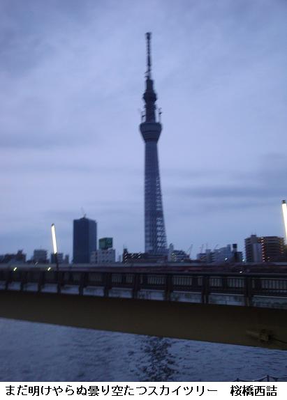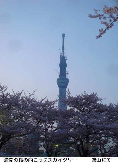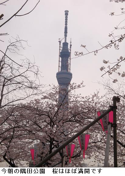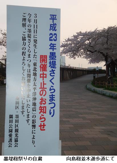 夜が明けたばかりの殆んど人通りのない、ちらりほらりと花びらの舞う桜並木の道を独り散策するのも乙なものである。築山の満開の桜の川越しに天樹塔(スカイツリー)が早くクレーンを下してくれと言っているよう。向島の桜並木の遊歩道には、花見中止の自粛看板が寂しくたっている。