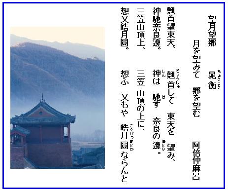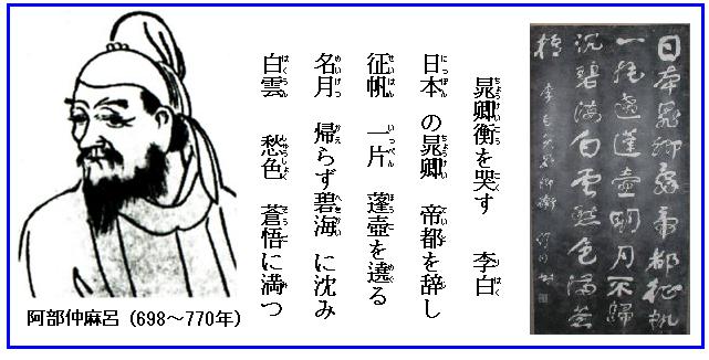 阿倍仲麻呂(698~770年)は阿部船守の子で吉備真備や玄昉とともに開元五(717、我が国の養老元)年、留学生として多治比県守(あがたもり)らの遣唐使に従って入唐、時に16歳であった。玄宗の時には秘書監・衛尉卿(えいいけい)などの官になったという。天宝十一載(752年、わが天平勝宝4年)入唐の藤原清河(ふじわらのきよかわ)らが翌年に帰国するとき、ともに第一船に乗って帰国しようとし、明州(今、鄞県)で詩を作ったという。この歌を詠んだ経緯については、天平勝宝5年(753年)帰国する仲麻呂を送別する宴席において、王維ら友人の前で日本語で詠ったなど諸説ある。紀貫之は『土佐日記』の中で次のように述べている。