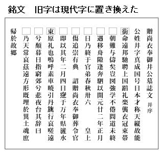 公は姓は井、字(あざな)は真成。国は日本と号し、才は天を縦(ゆる)せるに称(かなう)。故に能く命を遠邦に□、上国に馳せ騁(むか)えり。礼楽を蹈(ふ)みて衣冠を襲う。束帯して朝(ちょう)□、与(とも)に儔(たぐ)うこと難し。豈に図(はか)らんや、学を強(つと)めて倦まず、道を問う聞くこと未だ終わらずに、□移舟に遇い、隙(げき)、奔駟に逢わんとは。開元二十二年(734)正月□日、乃ち官弟(かんてい)に終る。春秋、三十六。皇上、□く傷みて、追崇するに典有り。詔して尚衣奉御を贈り、葬は官を令(し)て□せしむ。即ち其の年の二月四日を以て、萬年縣のサン水の□原に葬る。礼なり。嗚呼、素車(そしゃ)、暁に引き、丹旗(たんちょう)、哀を行う。遠□を嗟(なげ)きて、暮日に頽(たお)れ、窮郊を指(おもむ)きて夜台に悲しむ。其の辞に曰く、□は乃ち天常、哀(かなし)きは茲(これ)遠方なること。形は既に異土に埋もれ、魂は故郷に帰らんことを庶(こいねが)うと。(□は欠字)―― 奈良大学教授・東野治之氏の読み下しによる
