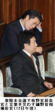 東日本大震災:「住めない」発言、国会でも追及 ―― 菅直人首相と松本健一内閣官房参与との会談で、福島第1原発周辺地域に「10年、20年住めない」とのやり取りがあったことを巡り、14日の参院内閣委員会で、野党議員が枝野幸男官房長官を追及した。町の一部が「計画的避難区域」に指定されている福島県川俣町の古川道郎町長も同日、官邸に菅首相を訪ね、「みんなが気にしている時にああいう発言は困る」と苦言を呈した。首相は「私は言ってない」と改めて発言を否定した。/小野次郎氏(みんな)は参院内閣委で「綸言(りんげん)汗のごとし、と言うように、トップの発言を後で訂正しても元には戻らない」と批判。岡田広氏(自民)も「国民の不安をさらに広げる」と指摘した。/枝野氏は「首相が何を考えているか、(間接的に)伝わった時に誤解され、国民に心配をかけないよう、十分留意しなければならない」と述べ、首相自身も言動に注意する必要があるとの認識を示した。 (毎日新聞 2011年4月15日 東京朝刊)