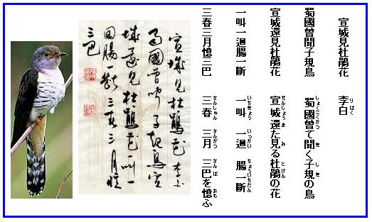 李白は753年頃宣城は安徽省長江流域の都市の地を訪れ、ここを拠点に長江流域を往復していたようである。この詩は宣城で眼にした杜鵑花から故郷蜀で聞いた子規の声を連想し、望郷の念に駆られた気分を歌ったものである。数字を効果的に組み合わせているのは、李白の得意とするところという。